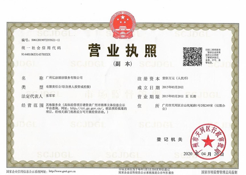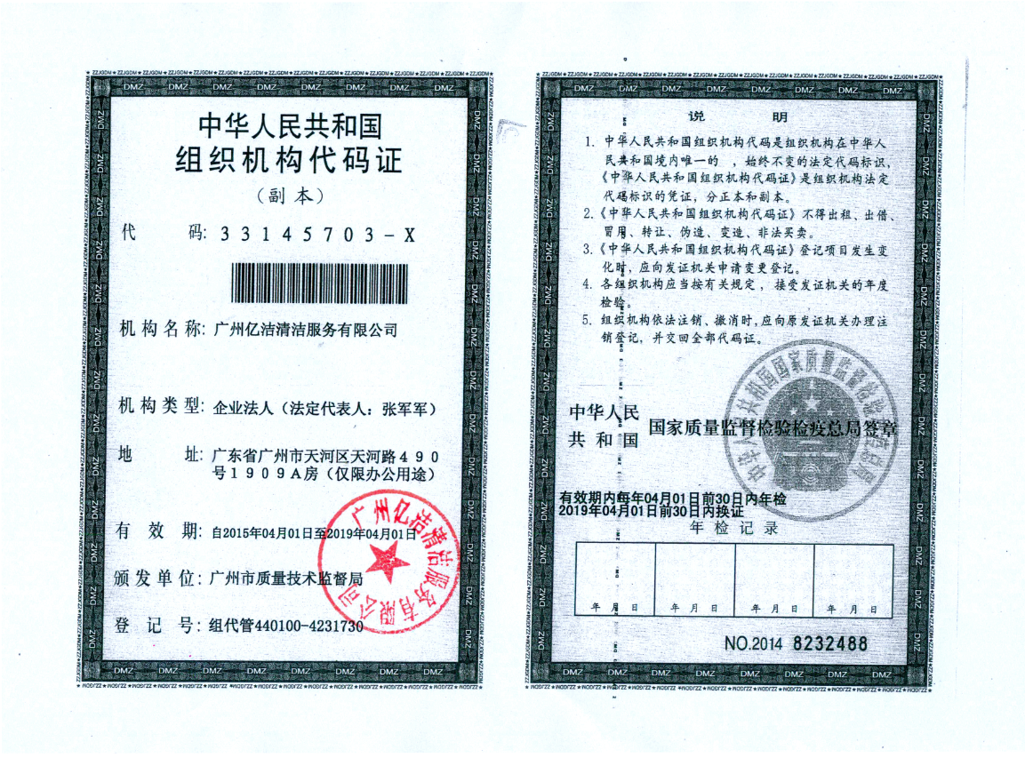 廣州億潔清潔服務(wù)有限公司是經(jīng)廣州市工商行政管理局批準(zhǔn)成立的(注冊資本:100萬元人民幣)。具有獨(dú)立法人資質(zhì)。公司成立2015年,公司具備完善的管理體系和高素質(zhì)管理隊(duì)伍,擁有特種技術(shù)人員33名,保潔服務(wù)人員上萬名,覆蓋廣州市,能及時(shí)調(diào)配并快速投入高效運(yùn)行。我們的每個(gè)員工都經(jīng)過公司的嚴(yán)格篩選,嚴(yán)格培訓(xùn),定期培訓(xùn)后持證上崗以保證服務(wù)品質(zhì),保障客戶的權(quán)利,利益,形象等不受損失。 廣州億潔清潔公司是一家設(shè)備齊全,技術(shù)強(qiáng)大的綜合型清潔服務(wù)公司,為客戶提供完善服務(wù)尊定了堅(jiān)定的基礎(chǔ)。 司于2010年全面推行了ISO9001質(zhì)量管理體系認(rèn)證和ISO14001國際環(huán)保體系認(rèn)證。先后獲得廣州高層建筑外墻清洗維修作業(yè)【安全資質(zhì)證書】、【廣州環(huán)衛(wèi)企業(yè)等級證書C級資質(zhì)】、廣州疾控中心頒發(fā)的【四害消殺服務(wù)資質(zhì)證】、【空氣治理A級資質(zhì)】、中國石材協(xié)會頒發(fā)的【石材資質(zhì)B級資質(zhì)】等。 廣州億潔清潔服務(wù)有限公司致力于打造專業(yè)、實(shí)惠、靠譜的保潔服務(wù)公司,把專業(yè)的事情交給專業(yè)的我們,您放心! 億潔清潔服務(wù)項(xiàng)目: 廣州保潔服務(wù):新建樓宇、別墅、酒店、醫(yī)院、辦公樓、賓館、企事業(yè)單位廠房竣工后開荒及裝修后精細(xì)保潔.工程保潔服務(wù)。 廣州物業(yè)托管:為廣州市各大企事業(yè)單位、賓館、政府機(jī)關(guān)、小區(qū)物業(yè)、酒店及廠房提供專業(yè)化保潔、園林、設(shè)施維護(hù)等管理服務(wù)。 廣州高空作業(yè):高空玻璃幕...[詳情]